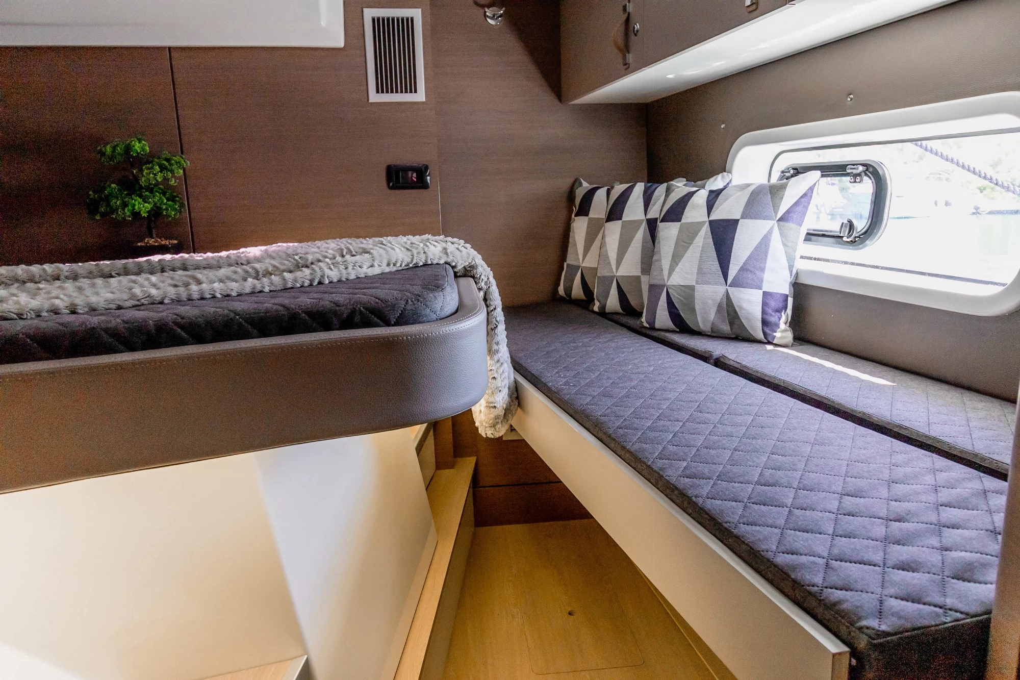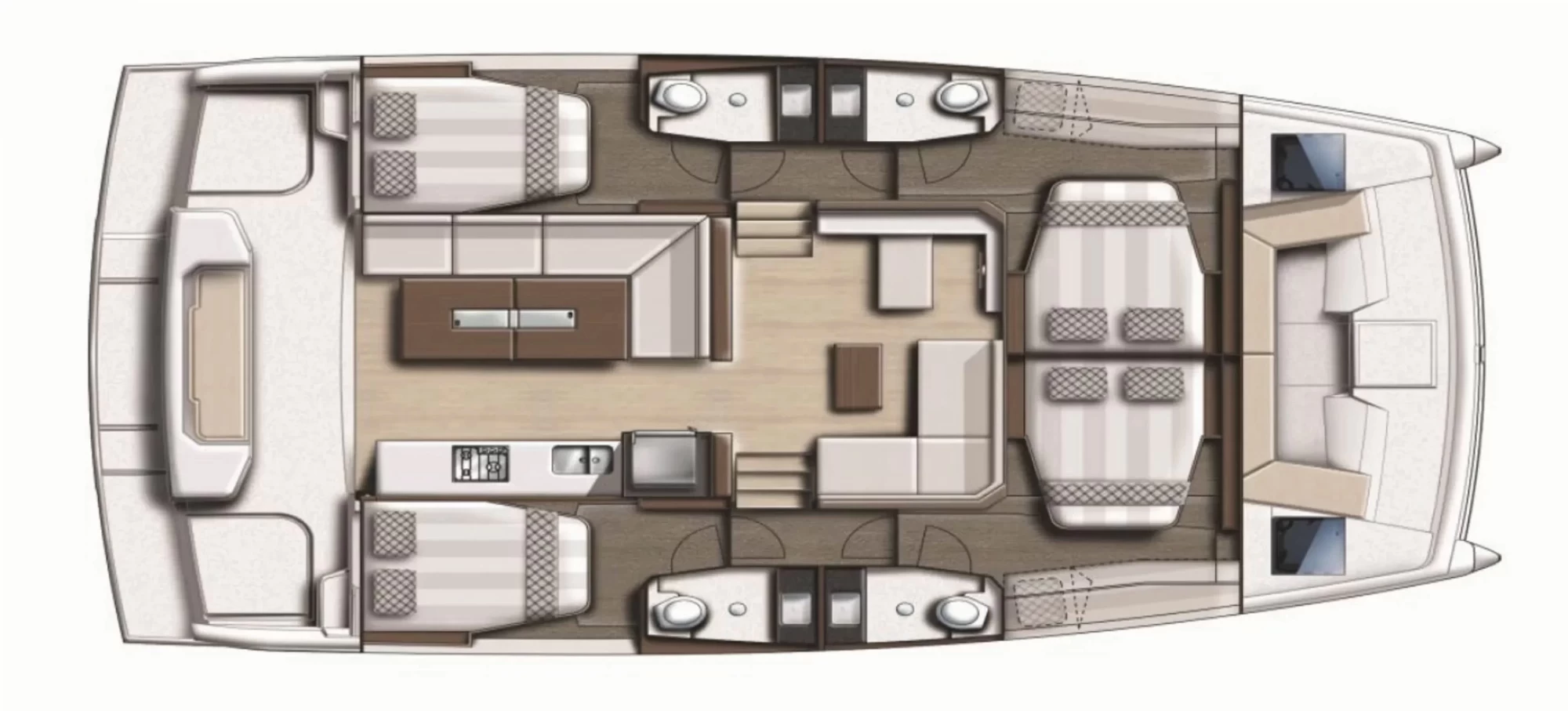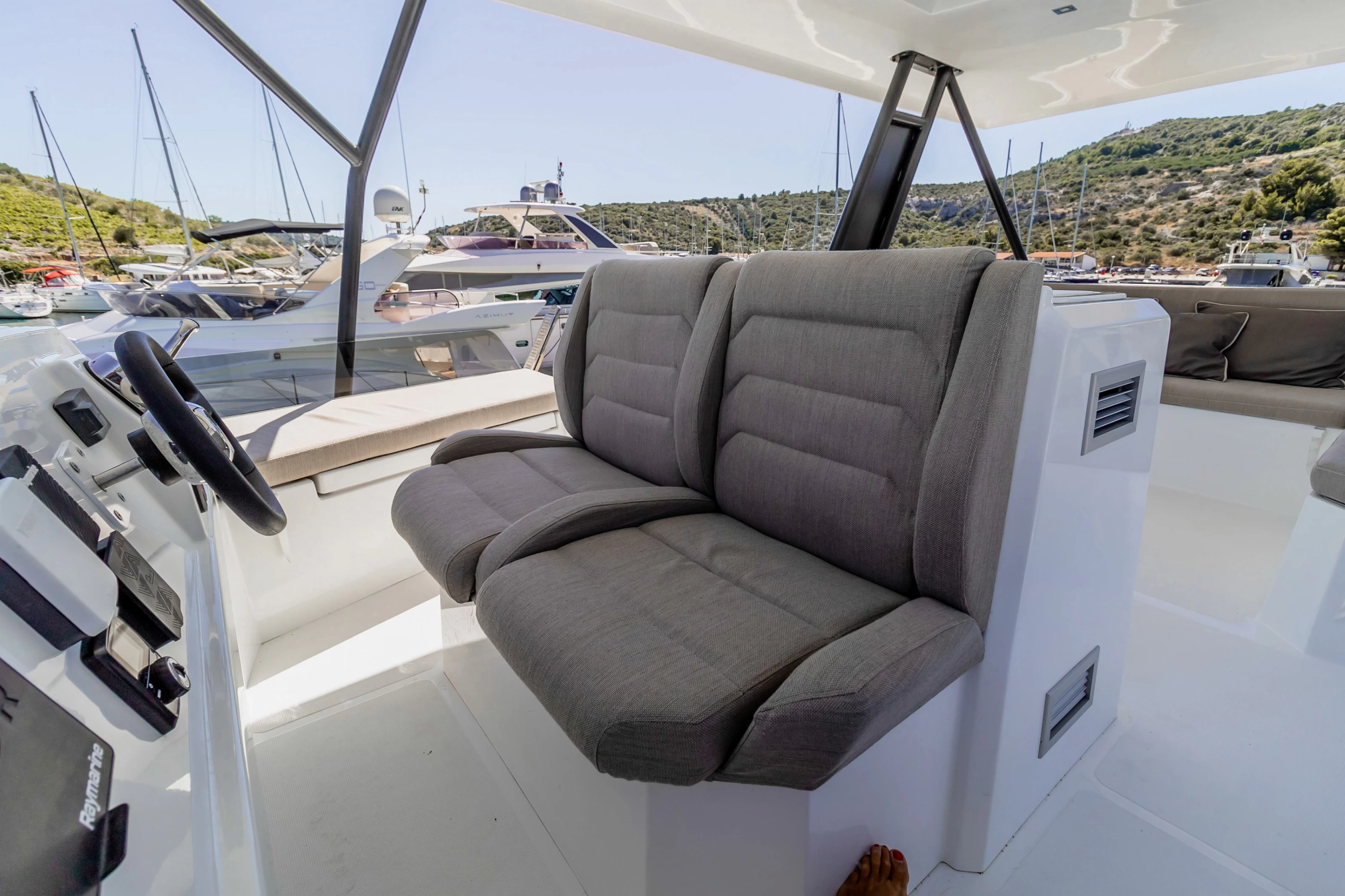 Leila can accommodate up to 8 people in 4 double cabins. Pillows and blankets are included in the price. It is equipped with a 2x250hp engine. Power catamaran Leila offers 4 toilets with a shower. Boat equipment features generator, BBQ, bimini and outside GPS plotter. It also boasts an air conditioning, audio system, outside speakers, flybridge and inside speakers. The fully-equipped galley includes a freezer, oven, cooker, sink and kitchen utensils.