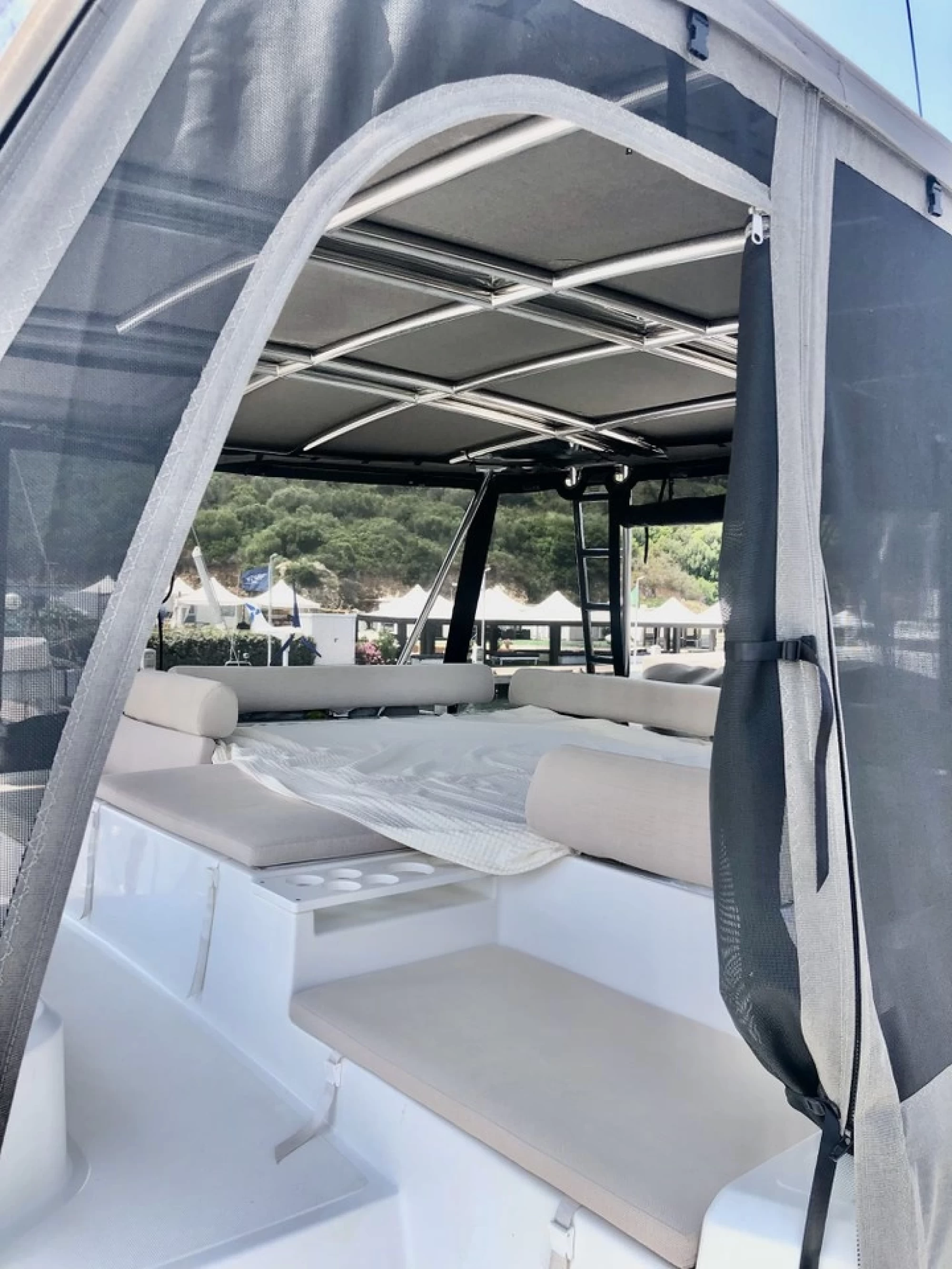 4-cabin catamaran Bali Catspace - Nammu was built in 2021 and it is docked in Marina Kremik, Croatia. Nammu can accommodate up to 10 people in 4 double cabins and a saloon with 2 extra beds. Pillows and blankets are included in the price. Catamaran Nammu offers 4 toilets with a shower. Boat equipment features classic mainsail, solar panels, generator, BBQ, bimini and outside GPS plotter. It also boasts a heating, air conditioning, audio system, outside speakers and flybridge. The fully-equipped galley includes a dishwasher, freezer, fridge, oven and cooker. This catamaran is operated by the charter company Q-yacht.