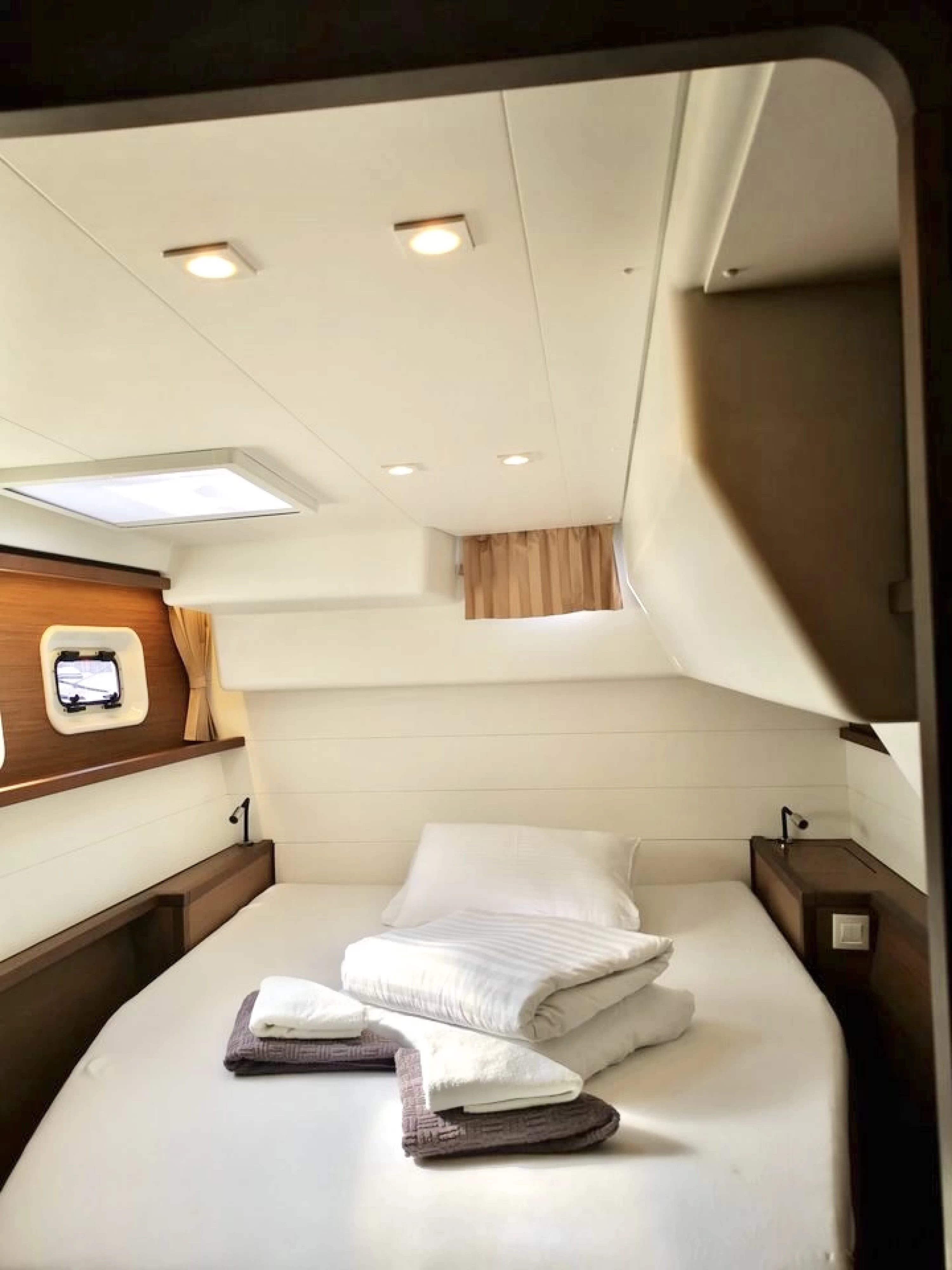 6-cabin catamaran Lagoon 450 F - Miriam was built in 2019 and it is docked in Marina Kremik, Croatia. Miriam can accommodate up to 12 people in 2 single cabins, 4 double cabins and a saloon with 2 extra beds. Pillows and blankets are included in the price. Catamaran Miriam offers . Boat equipment features classic mainsail, electric winches, radar, generator, bimini and outside GPS plotter. It also boasts a heating, air conditioning, audio system, outside speakers and flybridge. The fully-equipped galley includes a freezer, fridge, oven, cooker and sink. This catamaran is operated by the charter company Q-yacht.