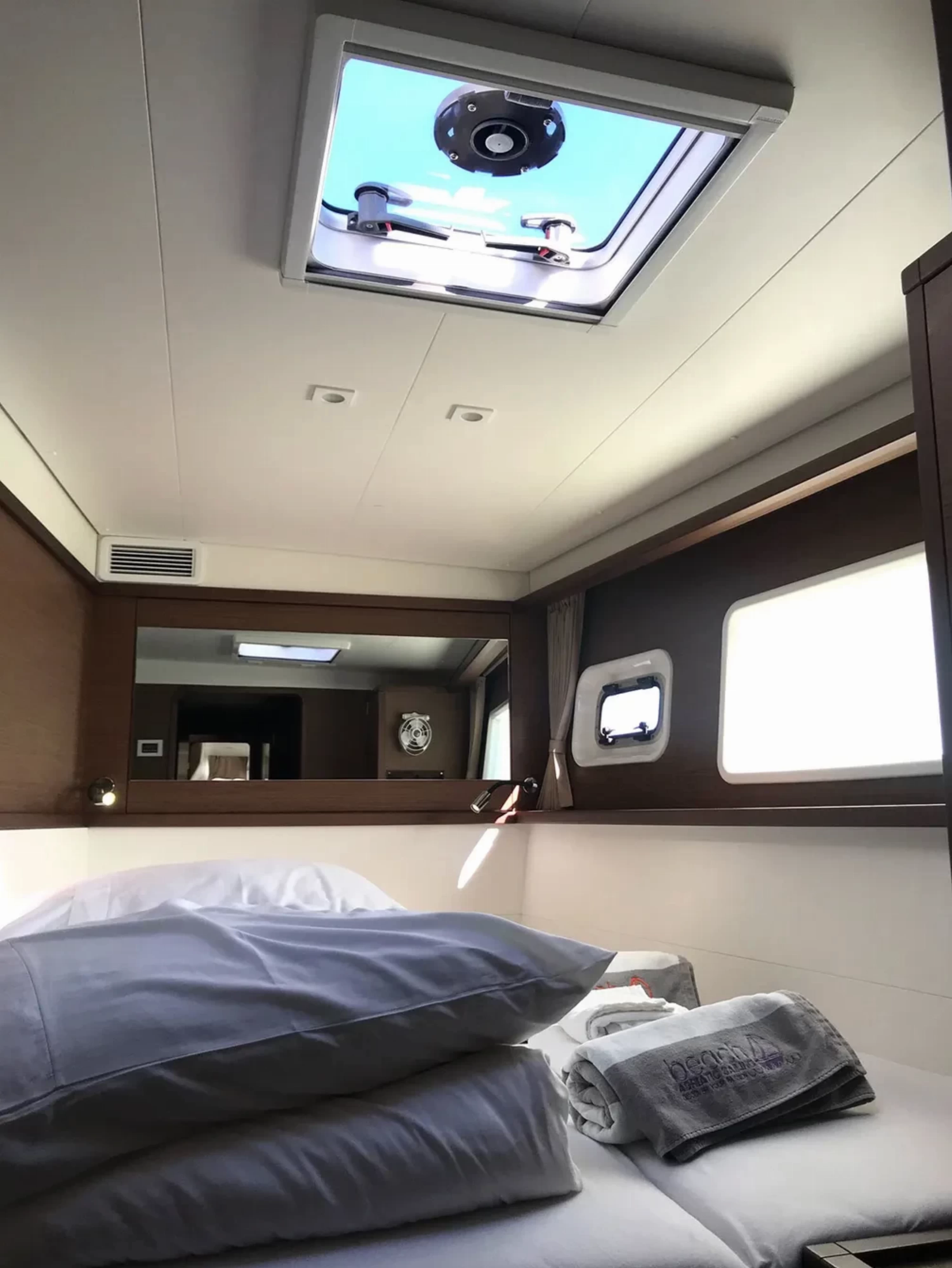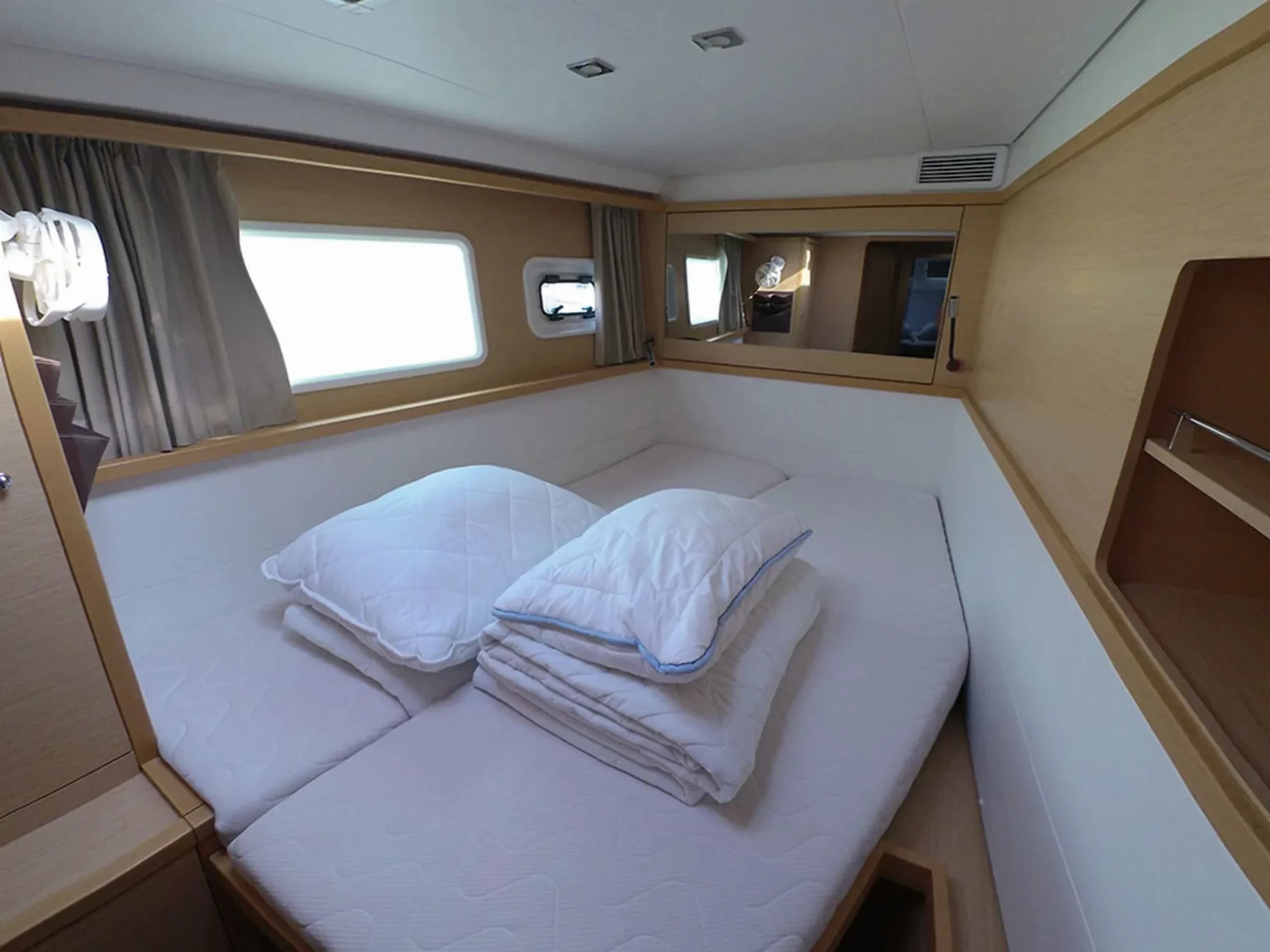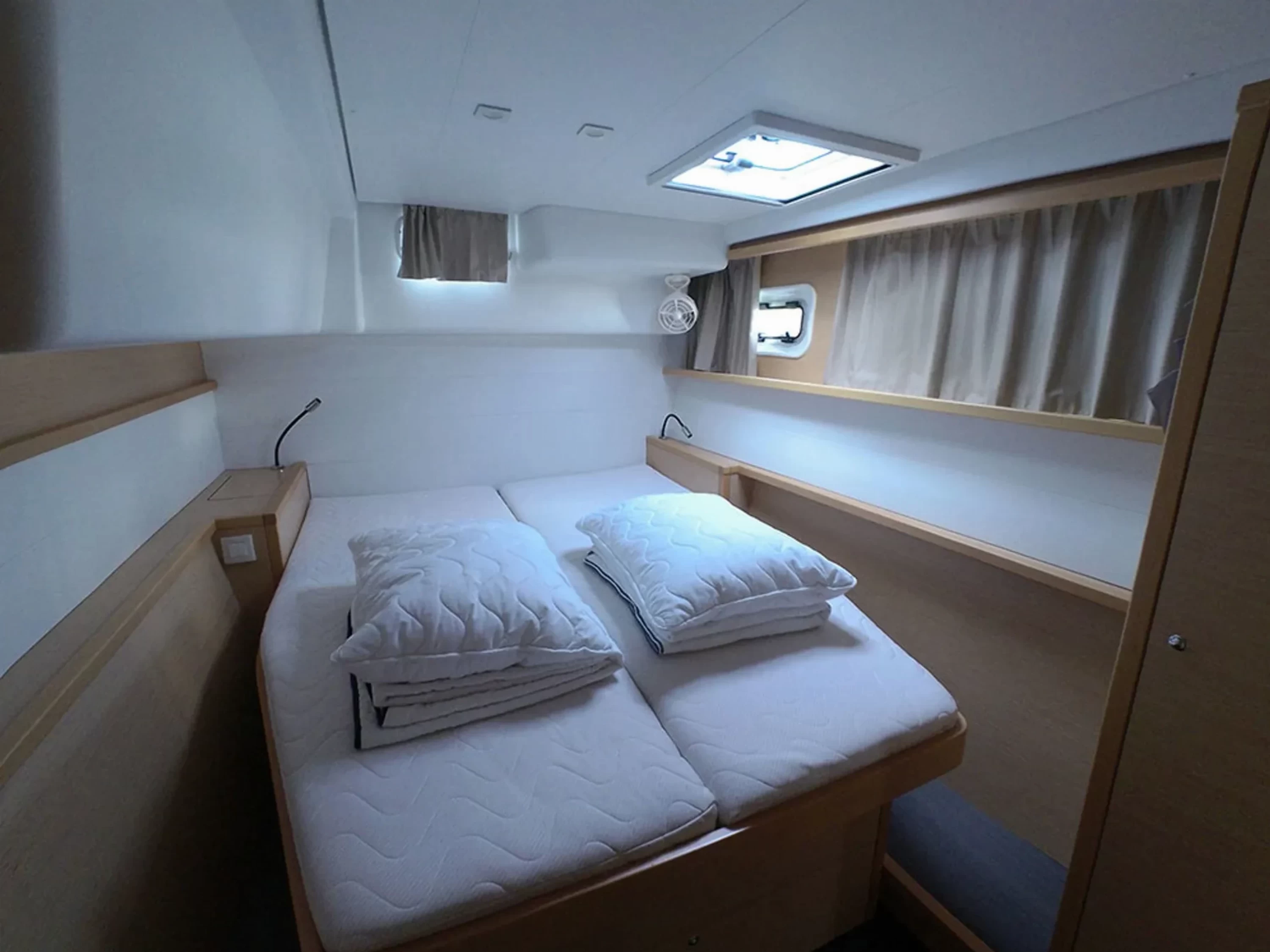 6-cabin catamaran Lagoon 450 F - Red Twin 2 was built in 2019 and it is docked in Marina Kremik, Croatia. Red Twin 2 can accommodate up to 12 people in 2 single cabins, 4 double cabins and a saloon with 2 extra beds.